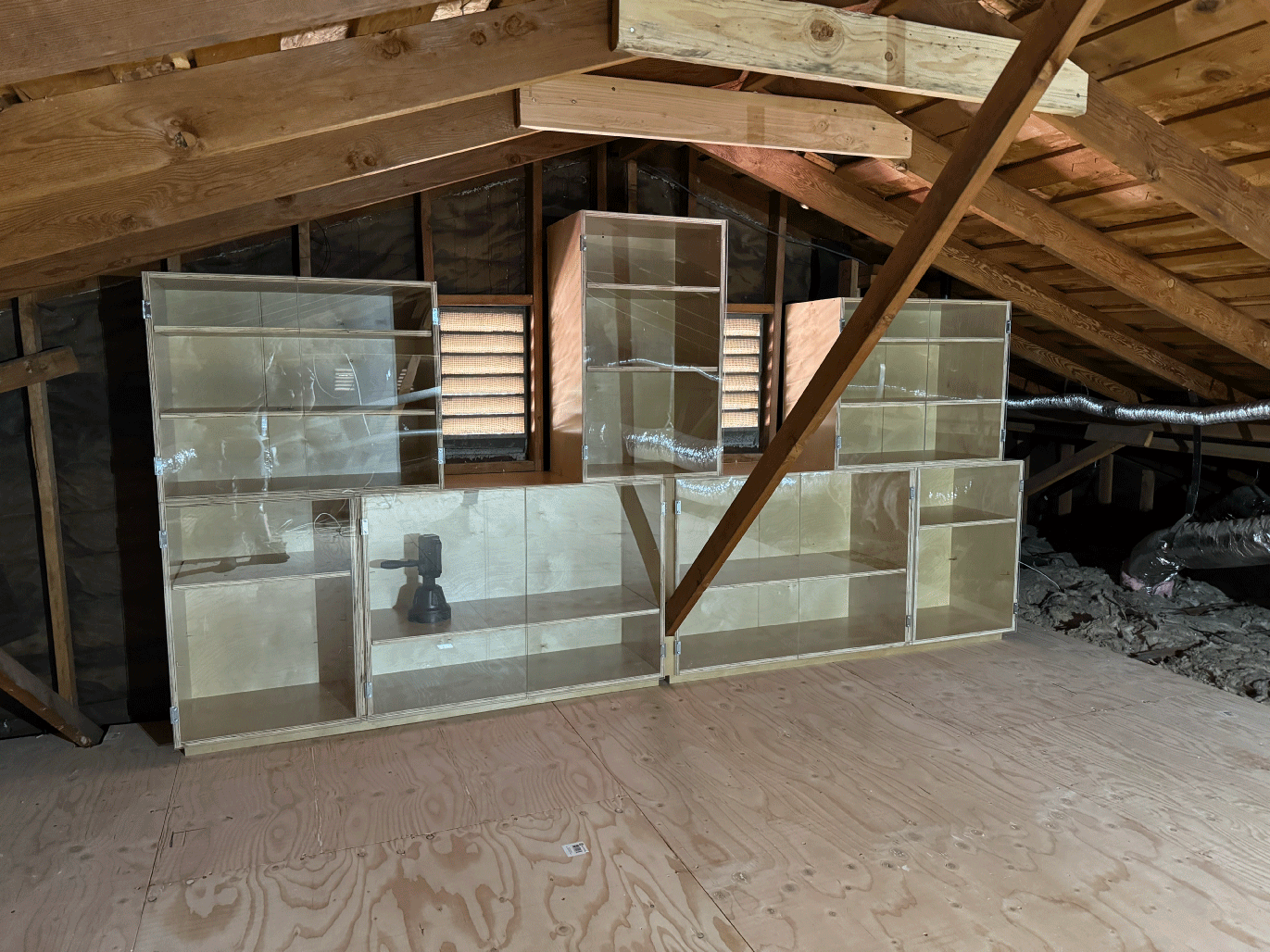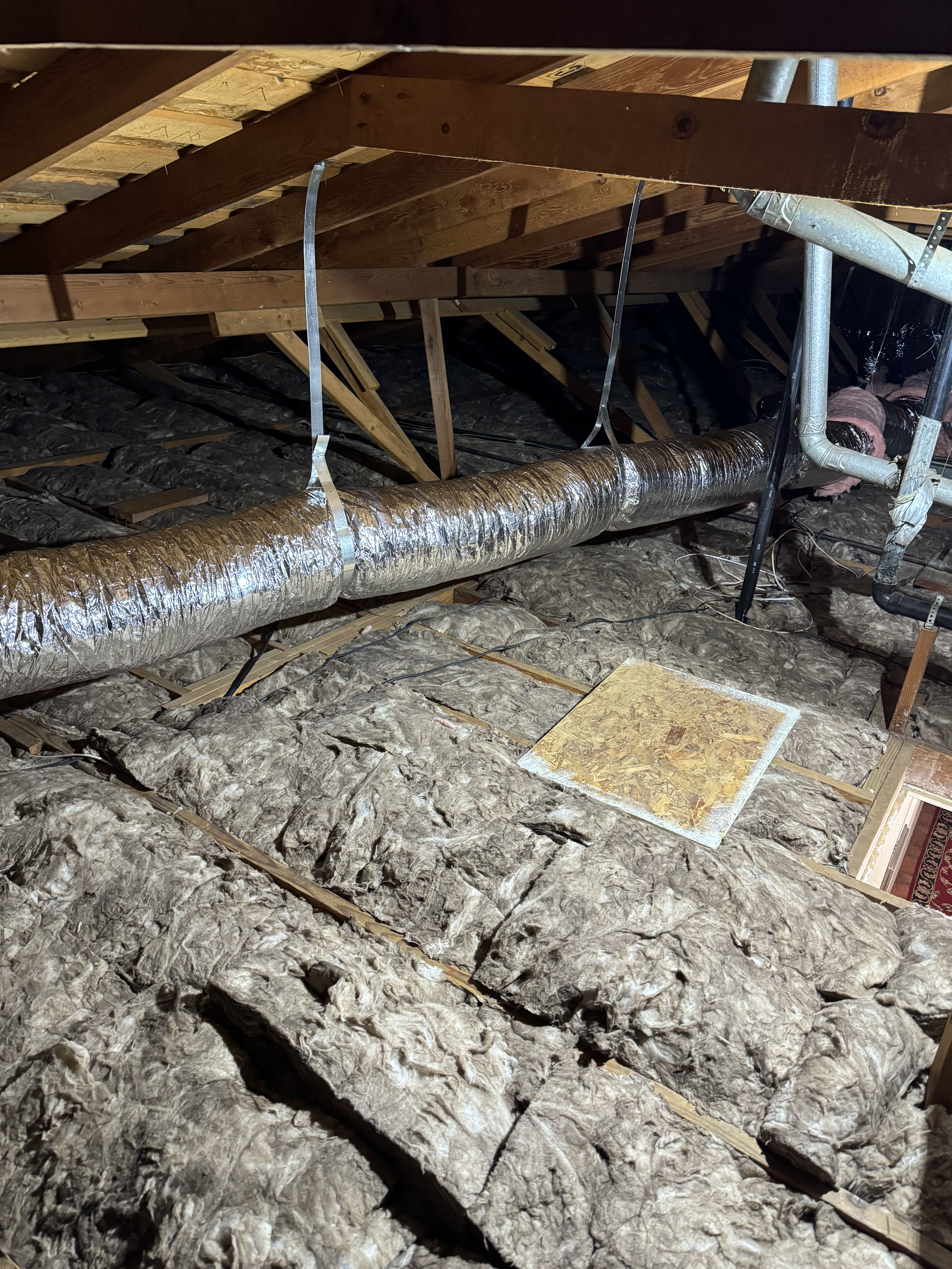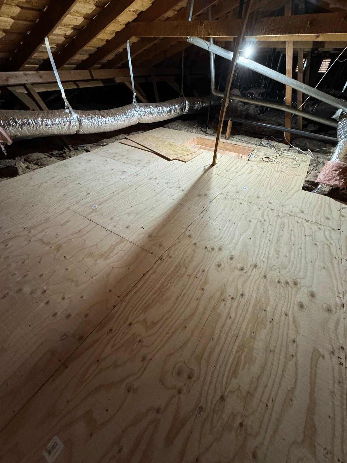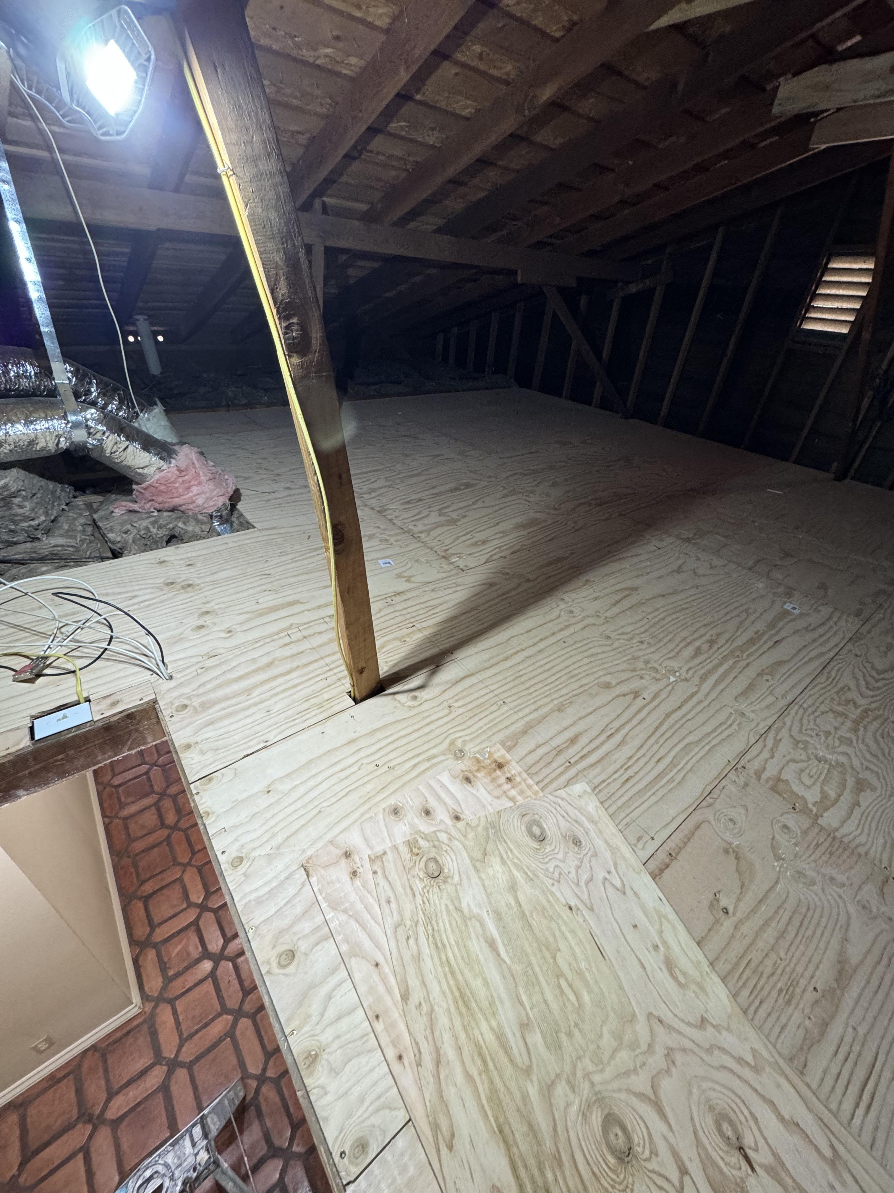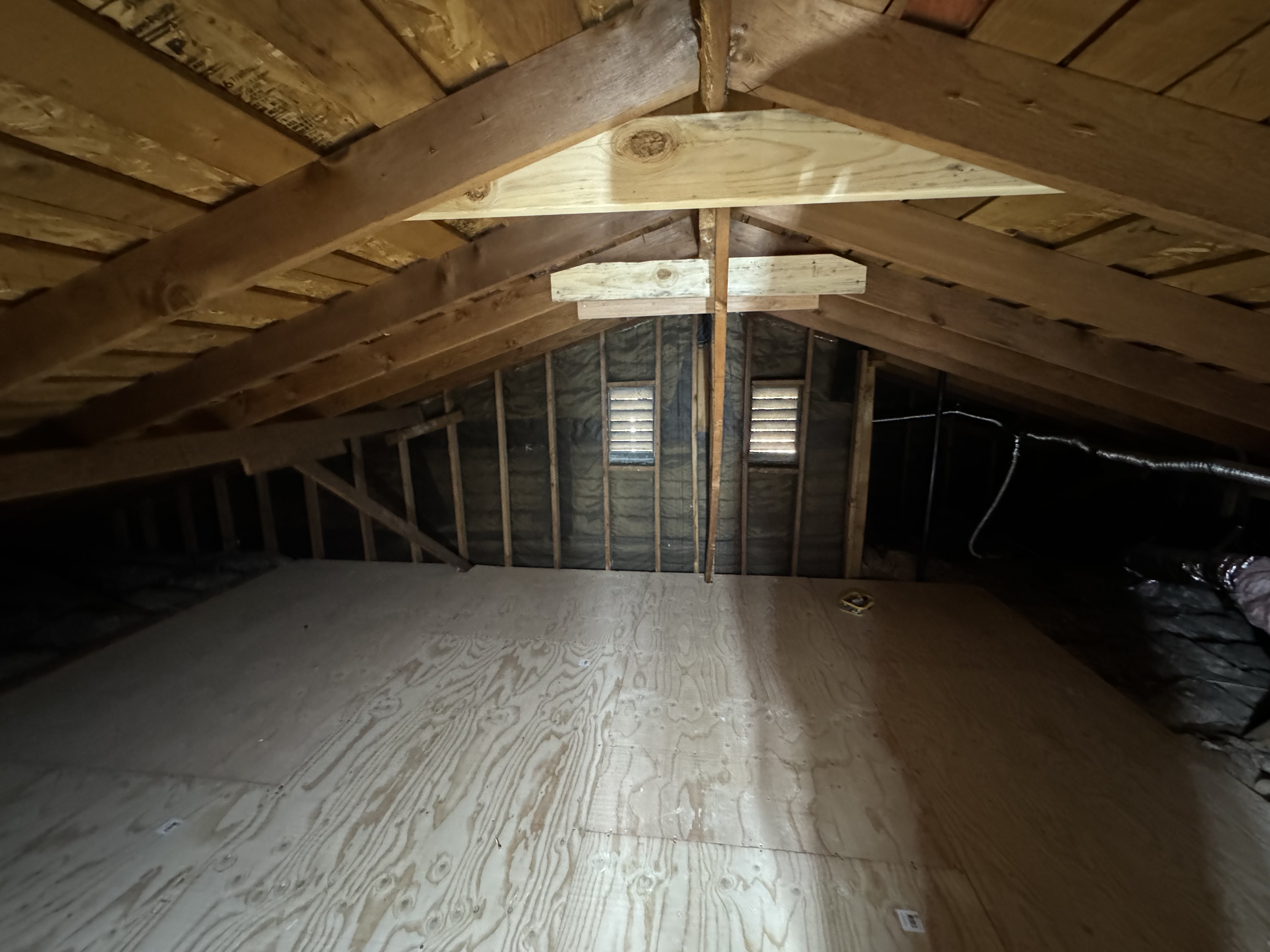 - Reinforced attic floor with new plywood sheathing for safer walkability